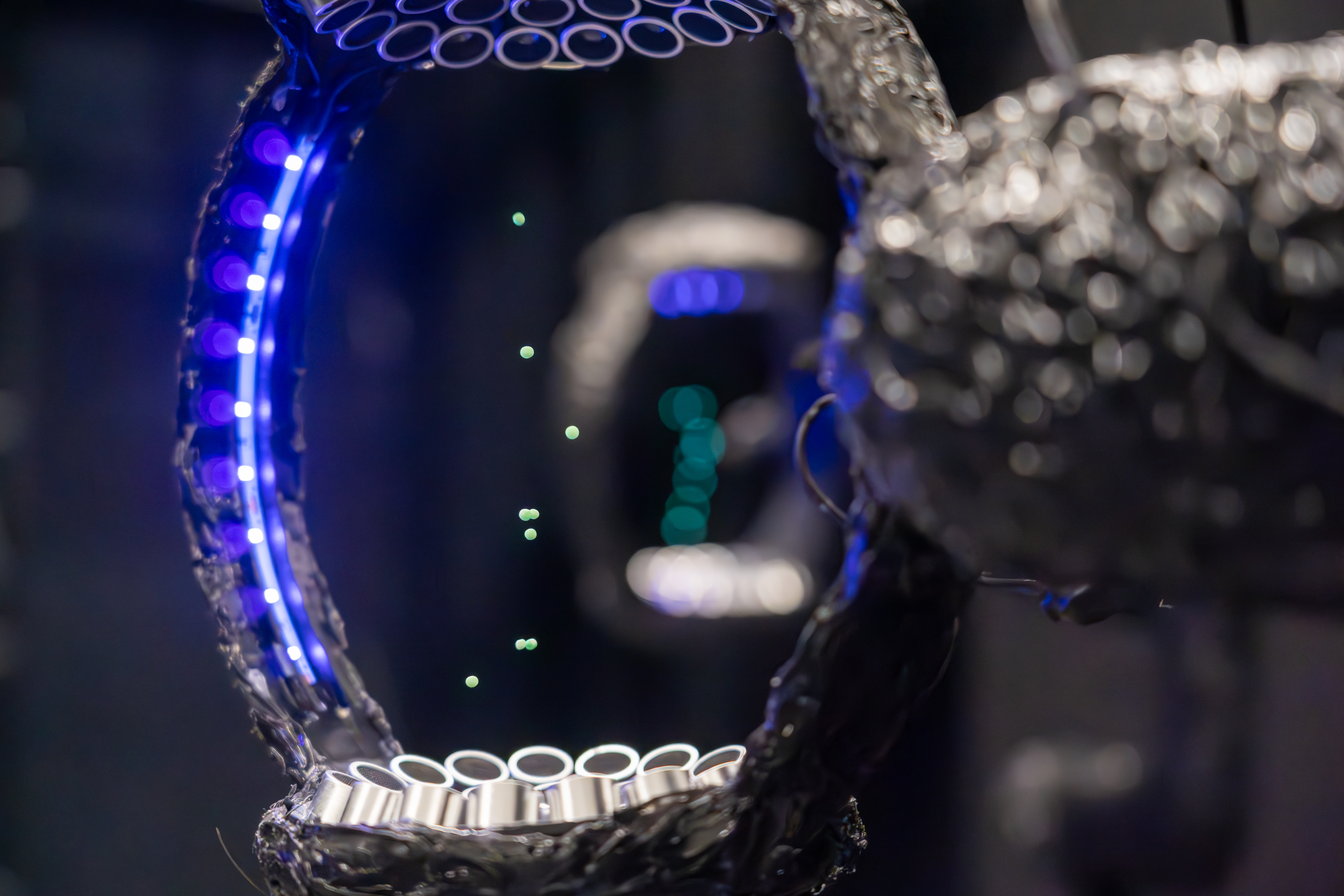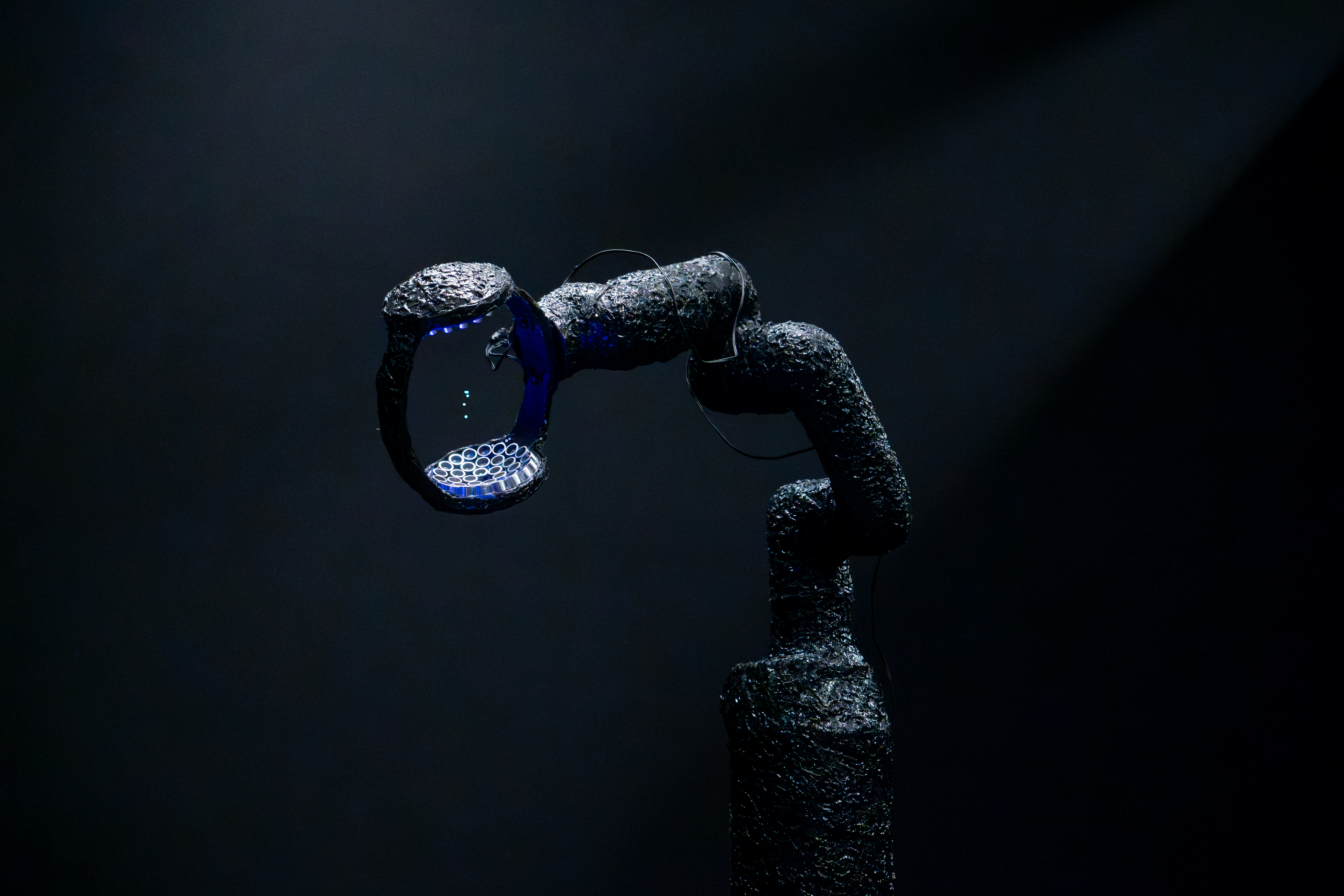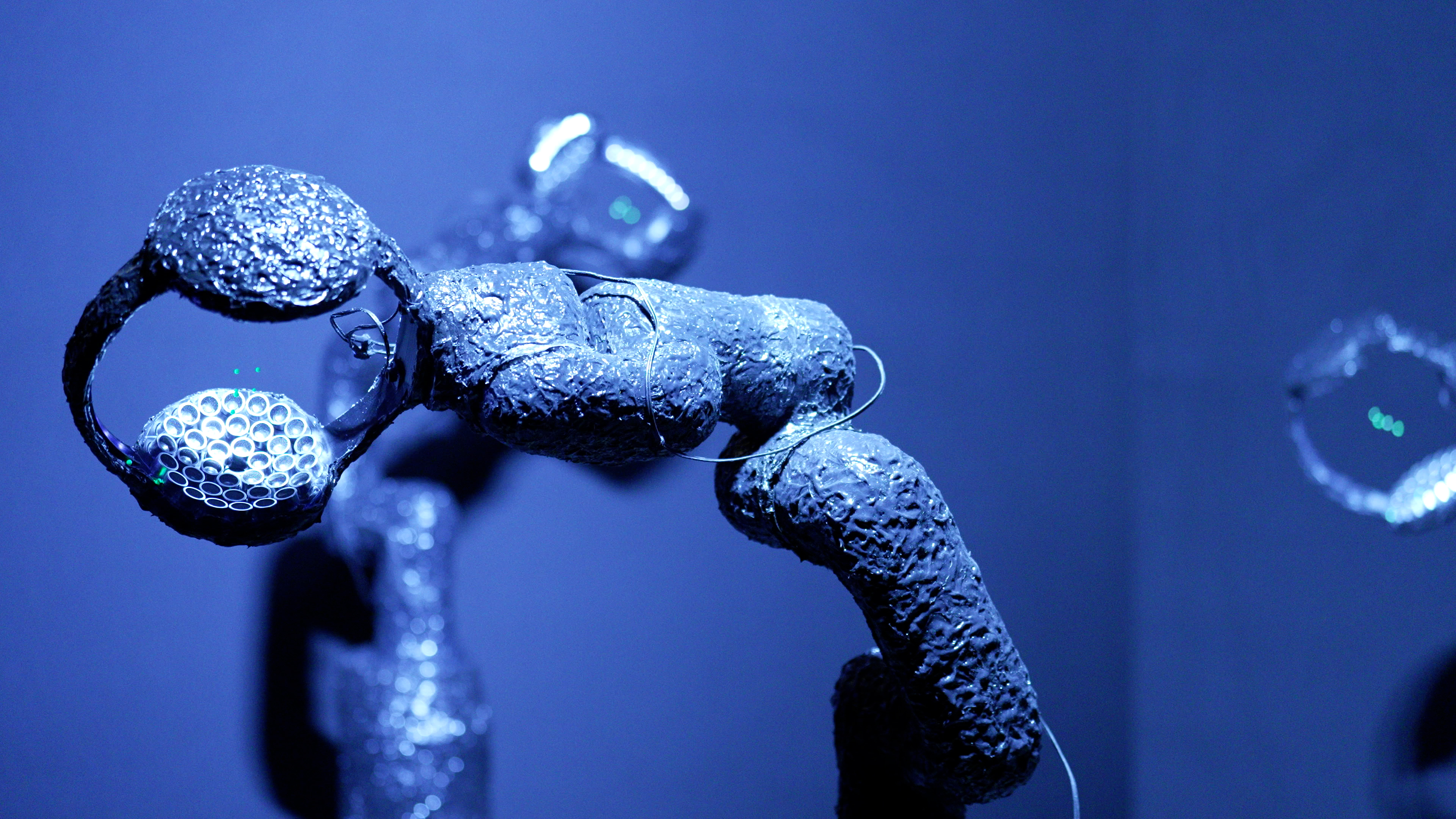 A emits fluorescent plastic fragments from its tentacles; these tiny pieces vibrate and flicker in response to changes in the surrounding environment. A becomes a sensory extension of these imperceptible environmental fluctuations, and the glowing plastic fragments not only symbolize A’s vitality, but also represent the fine airborne particles—particularly microplastics—that invisibly surround us and impact our health and ecosystems.